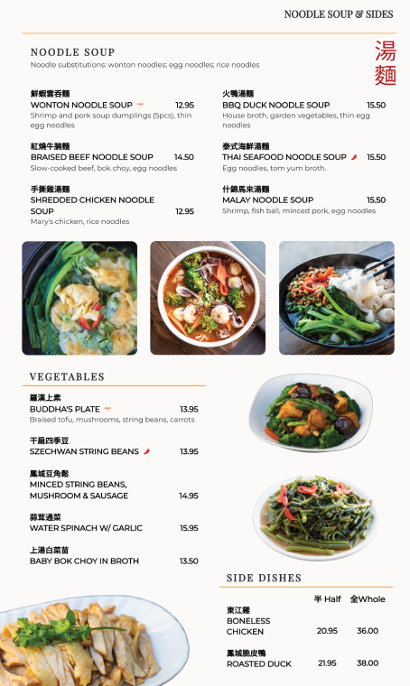 Vegetable dishes such as Buddha’s Plate, Szechwan String Beans, and Baby Bok Choy in Broth provide balance, while staples like Add White Rice (Individual) round out the meal. For carbs, the variety is impressive: Yeung Chow Fried Rice, XO Seafood Fried Rice, Hong Kong Rice Noodles w/ Beef, Singapore Noodles, and comforting bowls like Shrimp & Pork Wonton Noodle Soup or Braised Beef Stew Noodle Soup.
