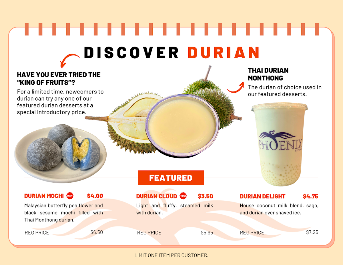 Monthong durian, custard, mochi, coconut.