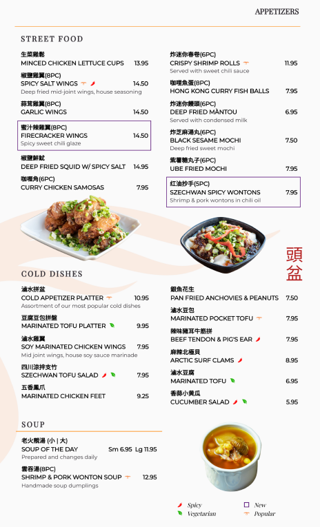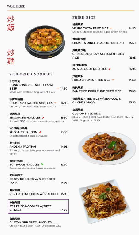 From a reviewer’s perspective, the menu at Phoenix Food Boutique - Arcadia feels like a carefully curated summary of classic Cantonese comfort food blended with popular pan-Asian flavors, making it an ideal destination for both group dining and casual solo meals. The journey often begins with refined Cold Dishes such as 滷水拼盆 Cold Appetizer Platter, Marinated Tofu Platter, or Soy Marinated Chicken Wings, which set a balanced, savory tone. The Street Food section adds energy with crowd-pleasers like Minced Chicken Lettuce Cups, Spicy Salt Chicken Wings, Garlic Chicken Wings, Deep Fried Squid With Spicy Salt, and Crispy Shrimp Rolls, all perfect for sharing.