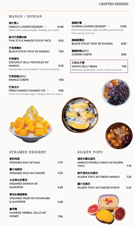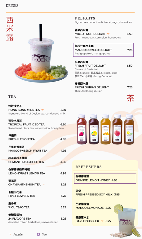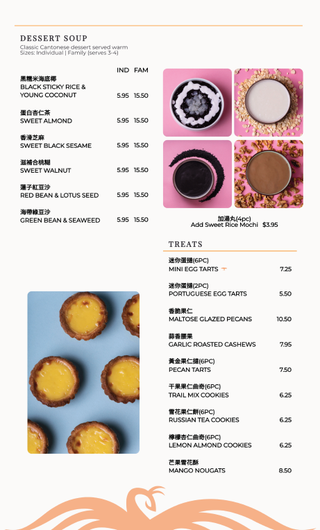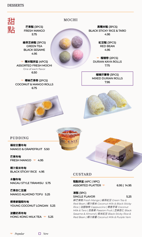 The menu concludes on a sweet note with an extensive dessert selection, from refreshing Mango Pomelo Delight and Young Coconut Delight to indulgent Fresh Mango Mochi, Black Sesame Pudding, Assorted Custard Platters, and traditional Dessert Soups like Sweet Black Sesame and Red Bean & Lotus Seed. Paired with classic drinks such as Hong Kong Milk Tea, Fresh Lemon Tea, or caffeine-free refreshers, the overall menu feels comprehensive, comforting, and thoughtfully designed-an apt reflection of Phoenix Food Boutique’s dedication to variety and tradition.