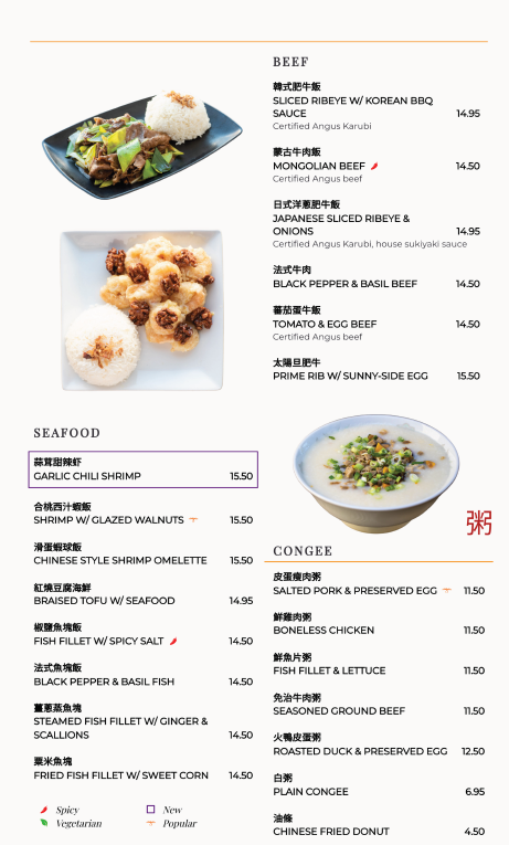 Soups like Chef’s Soup of the Day and Shrimp & Pork Wonton Soup provide warmth before moving into hearty mains. The kitchen shines with its Chicken selections, including Hainan Chicken, Phoenix Boneless Chicken, Kung Pao Chicken, and Tangerine Chicken, while pork lovers can rely on comforting classics such as Hakka Braised Pork Belly, Sweet & Sour Pork Chop, and Mapo Tofu w/ Pork. Beef and seafood are equally well represented with favorites like Mongolian Beef, Kung Pao Beef, Garlic Chili Shrimp, Shrimp & Glazed Walnuts, and Fish Fillet w/ Bali Sauce.